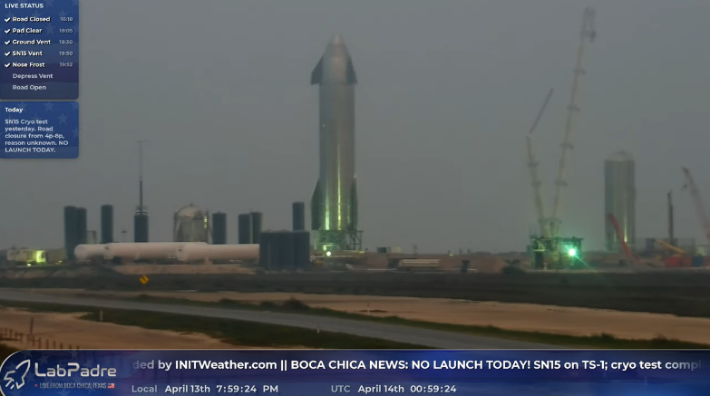 Spacex is performing a cryogenic proof test with starship sn15 to verify that the vehicle is ready to perform a test flight later this month. Sn15 has completed a ambient pressure test as seen on labpadre. It is unknown if the test was successfu. Then followed by two static fire tests. Sn15 cryogenic tank testing live.